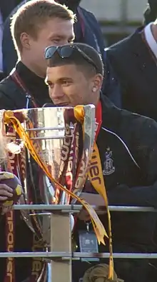 Wells scored a penalty on the opening day of the 2012–13 season in an away match against Gillingham.[43] He scored his second goal of the season on 25 August in a 5–1 win against AFC Wimbledon, and also assisted the fifth goal, crossing for James Hanson to score with a header.[44] In September 2012, Wells suffered a hip injury.[45] On 25 September, Wells came off the bench to score two late goals to help Bradford overturn a 2–0 deficit against Burton Albion in the League Cup third round, with Bradford going on to win the game 3–2 in extra time.[46] At the end of September 2012, Wells signed a new three-year contract with the club,[47][48] in a move praised by Phil Parkinson, the club's manager.[49] In October 2012, Wells was banned by the club from celebrating his goals.[50] As the January 2013 transfer window opened, Bradford City dismissed rumours linking Wells with a move away from the club.[51] On 8 January 2013, he helped Bradford beat Premier League side Aston Villa 3–1 in the first leg of the semi-final of the League Cup by opening the scoring in the 19th minute.[52] After appearing in the 2013 League Cup Final, Wells became the first player from Bermuda to appear in an English major cup final.[11] Although Wells did not complete the game,[53] prior to the match he spoke about being motivated by the recent death of a friend in a motorcycle accident,[54] as well as how he was looking forward to facing opponents from a higher league.[55] Wells hadn't scored for the club since 2 February 2013,[56] until he scored the only goal of the game on 6 April 2013, in a 1–0 home victory against Northampton Town.[57] Later that month, he was linked with a transfer to Burnley.[58]