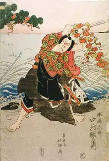 ![]() Nakamura Utaemon III in the role of Genzō Takebe. Woodblock print by Toyokuni Utagawa, early 19th century | |