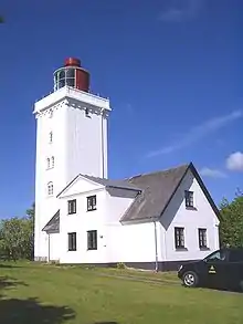 Nakkehoved Lighthouse (Danish: Nakkehoved Fyr) was originally the name for two individual lighthouses above the namesake Nakkehoved cliffs, between Gilleleje and Hornbæk, approximately 40 km north of Copenhagen, Denmark. Since the eastern lighthouse was decommissioned in 1898, the name Nakkehoved lighthouse has come to refer to only the western tower, which is still operational. The eastern lighthouse was listed on the Danish registry of protected buildings and places in 1976. The western lighthouse was also listed on the registry in 2002.