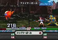 When units engage in battle, the game transitions into a horizontal view. Timed button presses trigger different attacks. Each unit's attack number is dictated by a counter labelled "Branch". When the Branch counter is depleted, the battle ends, and if the enemy unit is defeated, they disappear from the map. Successful attacks begin a combination, which increase a character's experience point (EXP) reward.[4] Continual attacks also raise a character's fatigue level, which when maxed out will prevent them from moving for several turns.[5]