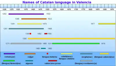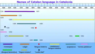 The first names, or glossonyms, of the Catalan/Valencian language formed in a dialectal relation with Latin, in which Catalan existed as a variety. These names already expressed the relationship between the two languages (Council of Tours 813). New names that related Catalan to Rome (lingua romanana, romançar or romanç) came about to dignify the Catalan language in the thirteenth century, though Latinists called it vulgar (or sermo vulgaris) and the people planus, or pla.