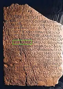 The exact origin and meaning of the ethnonym Hr̀vāt (Proto-Slavic *Xъrvátъ,[7][8] or *Xurwātu[9]) is still subject to scientific disagreement.[10] The first etymological thesis about the name of the Croats stems from Constantine Porphyrogennetos (tenth century), who connected the different names of the Croats, Βελοχρωβάτοι and Χρωβάτοι (Belokhrobatoi and Khrobatoi), with the Greek word χώρα (khṓra, "land"): "Croats in Slavic language means those who have many lands". In the 13th century, Thomas the Archdeacon considered that it was connected with the name of inhabitants of the Krk isle, which he gave as Curetes, Curibantes. In the 17th century, Juraj Ratkaj found a reflexion of the verb hrvati (se) "to wrestle" in the name.[11] A more contemporary theory believes that it might not be of native Slavic lexical stock, but a borrowing from an Iranian language.[12][13][14][15][16] Common theories from the 20th and 21st centuries derive it from an Iranian origin, the root word being a third-century Scytho-Sarmatian form attested in the Tanais Tablets as Χοροάθος (Khoroáthos, alternate forms comprise Khoróatos and Khoroúathos).[6][12][17]