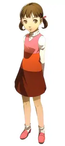 Nanako Dojima was created for Persona 4. She is the young cousin of Yu Narukami, and Ryotaro Dojima's only daughter. Nanako is a guileless girl, and is usually left at home due to her father's work. Nanako is capable of taking care of herself. She is voiced by Akemi Kanda in Japanese and Karen Strassman in English.[1][2] When designing Nanako as a playable character for Persona 4: Dancing All Night, designer Kanami Mashita desired to avoid potentially making her too flamboyant or provocative in how she dances, as he found these "completely out of character." The design staff employed an adult idol do the motion capture rather than a child dancer, which created problems as it took time and effort to avoid giving Nanako "allure" from the idol's dancing.[3]