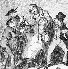 Instead, Nancy and her friend Bet are introduced using faux-genteel terminology, portrayed as if seen though Oliver's innocent eyes, but recognisably ironic to the reader. Bet's brash refusal to get something for Fagin is described as "a polite and delicate evasion of the request" showing "the young lady to have been possessed of natural good-breeding."[6] Nancy's visit to the magistrates is described in similar language. Only later, when Nancy speaks to Rose, does she explicitly describe herself as degraded and corrupted. Their criminal enterprises are spoken of in euphemisms, creating for the reader a "game of guessing the crime".[5]