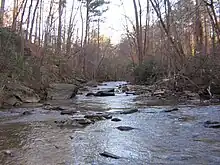 Nancy Creek is a 16.3-mile-long (26.2 km)[1] stream in northern Atlanta, Georgia, United States. It begins in far northern DeKalb County, just north of Chamblee, and flows southwestward into Fulton County, through the far southeast corner of Sandy Springs, then through the Buckhead area of Atlanta. It empties into Peachtree Creek, which then flows into the Chattahoochee River, south of Vinings and Paces. The Chattahoochee eventually joins with the Flint River to create the Apalachicola River, which flows into the Gulf of Mexico. The North Fork Nancy Creek is a major tributary, while Little Nancy Creek tends to run low or dry. Other tributaries include Bubbling Creek which originates in Chamblee, Perimeter Creek which originates in Dunwoody and Silver Creek which includes the 38-acre Silver Lake and Little Silver Lake.