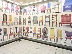 The design of the Taipei Metro portion of the station centers around a "Nostalgia and Technology" theme with aqua green selected to signify an image of a fish pond. Paintings by artist Jimmy Liao are displayed around the station including on the platform walls. Many areas have sandblasted glass installed.[15] On the platform, a piece titled "Rapid Transit Platform, the Transport Dock" displays images on benches to evoke memories of former industries in Nangang.[16]