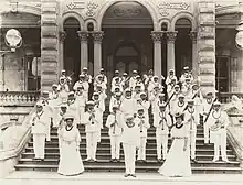Alapai received no formal musical training, but learned how to sing by entertaining audiences.[1][15][16] There is disagreement about her tenure with the Royal Hawaiian Band. Based on her 1906 biography printed in the Hawaiian language newspaper Ka Nupepa Kuokoa, she joined the band around 1897 (nine years before the publication of the biography).[1] At the time, Henri Berger was bandmaster and hired her to sing with the Band as a female soprano soloist.[17][15][18] Later erroneous sources, including the personal interviews of Kahauanu Lake, and articles written in the Haʻilono Mele newsletters of the 1970s, claimed she was the band's first female vocalist, debuting with them in 1873, singing with the band for 40 or 43 years.[13][19][20][21] However, census records taken during her second marriage show that she was not even born in 1873.[7]