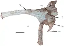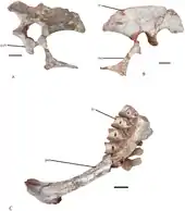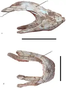 The rostral end of the mandibular symphyseal region is not downturned in Nankangia, as in caenagnathids, Incisivosaurus, Luoyanggia and Ganzhousaurus. Unlike the V-shaped mandibular symphysis of Luoyanggia, Nankangia and other oviraptorosaurs have a U-shaped mandibular symphysis. Although Nankangia and Jiangxisaurus possess similar lower jaws, the medial margin of the humerus is more curved medially in Nankangia than it is in Jiangxisaurus. Based on its phylogenetic position, Nankangia displays five other possible autapomorphies, including an anteriorly projecting acromion, separated anterior and greater trochanters, dorsoventral extension of the pubic peduncle that is deeper than the ischial peduncle, and the lack of a downturned symphyseal portion of the dentary. The latter trait is shared with the coeval Ganzhousaurus and Jiangxisaurus, suggesting a primarily herbivorous diet, whereas Banji and another unnamed oviraptorid from the same formation may have been more carnivorous, as they bear a downturned mandibular symphysis.[1]