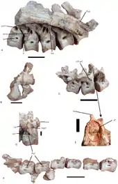 Nankangia is distinguished from all other oviraptorosaurians based on a combination of traits, some of which are autapomorphic (i.e. unique). On the ventral surface near the base of the transverse process of the dorsal vertebrae two infradiapophyseal fossae are present. The sacral vertebrae bear slit-like pneumatic fossae. The neural spines of the anterior caudal vertebrae are wider transversely than anteroposteriorly, forming a large posterior fossa with a rugose central area. These vertebrae possess a large fossa on the anterior surface of the base of the transverse process (infraprezygapophyseal fossa) and as well as an infradiapophyseal fossa on the ventral surface of the transverse process.[1]