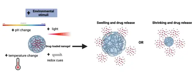Light-responsive nanogels can be triggered to release their cargo with exposure to light at a certain wavelength.[10] These nanogels are synthesized to contain specific acrylic or coumarin-based bonds that cleave during a photoreaction.[10] With the tunability of the wavelength of light, energy, and time of irradiation, light-responsive nanogels can be triggered to degrade with an increased control over crosslinking density.[10] For example, both the swelling and size of light-responsive nanogels with vinyl groups were found to decrease and produce a sustained release of drugs after irradiation with UV light.[10]