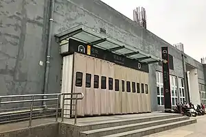 The station concourse is located on the ground level while the single island platform is underground on the B1 level.
