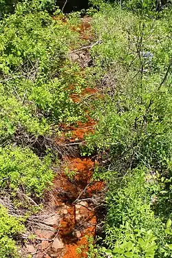 There is some evidence of sewage contamination, including sewer odors and debris, in the lower reaches of Nanticoke Creek.[4] The city of Nanticoke has a permit to discharge sewage into the creek.[10] Four combined sewer overflows are present in the watershed.[7] Orange sediment is deposited on the creek's streambed, indicating a high concentration of iron in the waters.[11] Yellow boy is also present along the creek in some places and can be seen from South Cross Valley Expressway.[8] The concentration of total dissolved solids in the creek is 622 milligrams per liter, higher than the United States Environmental Protection Agency criterion for suitability for aquatic life.[7]