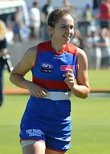 Naomi Ferres (born 26 October 1997) is an Australian rules footballer playing for the Western Bulldogs in the AFL Women's (AFLW). Ferres was drafted by the Western Bulldogs with the club's first selection and the third pick overall in the 2017 AFL Women's rookie draft from the VU Western Spurs .[1] She was upgraded to the Bulldogs' main playing list following an injury to Kimberley Ebb and subsequently made her debut in the twenty-six point win against Fremantle at VU Whitten Oval in the opening round of the 2018 season.[2][3] Ferres received a nomination for the 2018 AFL Women's Rising Star award in the Bulldogs' round 7 win over Melbourne.[4]