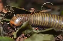 Narceus gordanus is a spirobolid millipede native to the southeastern United States. Common names include Smokey Oak Millipede and Smokey Ghost Millipede. Adults range from around 60 to 120 mm (2.4 to 4.7 in) in length, up to 13 mm wide, and possess 45 to 65 body segments. The body color is lighter than other species of Narceus, with each body ring a light greenish tan followed by a band of darker tan. N. gordanus also has shorter legs than other Narceus species, and a deeper groove on the head in which the antennae rest.[1]