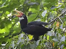 The hornbill is predominantly frugivorous. Based on seeds in the middens below nesting trees, the following food tree species were identified:[9] Anamirta cocculus, Capparis sepiaria, C. tenera var. latifolia, Garuga pinnata, Amoora rohituka, Terminalia catappa, and Ixora brunniscens. Nine species of fruits were recorded in their diet in a later study:[8] Caryota mitis, Myristica andamanica, Artocarpus chaplasha, Dillenia indica, Sideroxylon longipetiolatum, Syzygium cumini, Ficus scandens, Ficus glomerata, and Ficus sp. Like other hornbills, they also consume invertebrates and occasionally feed on small reptiles.[10] They sometimes mob white-bellied sea eagles that fly too close.[8][9] Being predominantly fruit eaters, they play an important role in the seed dispersal of figs and other plant species.[11][12] Figs are important in the ecology of many other insular hornbill species and are a major factor determining the distribution patterns of hornbills in forests.[13]