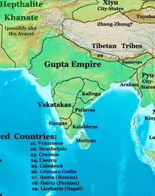The inscriptions of Prithivishena II, Narendrasena's son and successor, assert that Narendrasena's authority was acknowledged by the rulers of Kosala, Mekala, and Malava.[3][8] Many historians regard this claim to be an empty boast or exaggeration, but it is possible that Narendrasena had indeed greatly expanded the Vakataka sphere of influence. The Gupta empire, then the hegemonic power in northern India, was embroiled in a war with invading Huna hordes, which left the Vakatakas free to expand into central India.[9] It is also possible that Narendrasena's prosecution of the war against the Nalas resulted in the further extension of Vakataka authority, especially in the area around present-day Chhattisgarh. Narendrasena might have invaded the Nala homeland and sacked their capital, for Skandavarman, a brother and successor of Bhavadattavarman, is said to have retrieved the fortunes of his family and had to repopulate his capital.[7]