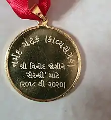 - ↑ "સન્માન: ગુજરાતી ભાષાના કવિ વિનોદ જોશીને નર્મદ ચંદ્રક એનાયત થશે". Divya Bhaskar (in Gujarati). 10 May 2022. Archived from the original on 12 June 2022. Retrieved 10 May 2022.