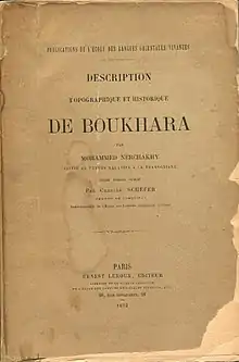 Abu Bakr Muhammad ibn Jafar Narshakhi (or Narshaki) (ca. 899–959), a Sogdian[1] scholar from the village of Narshak in the Bukhara oasis is the first known historian in Central Asia. His unique History of Bukhara (Tarikh-i Bukhara) was written in Arabic and presented to the Samanid emperor Nuh I either in 943 or 944. The book provides important information on Bukhara that cannot be found in other contemporary sources. Nothing is known about Narshakhi except his authorship of this one book.[2]