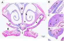 Cross-section from the chicken's nasal cavity. (A) Panoramic scanning of the section, (b) concha nasalis media, (c) meatus nasi, (d) optic nerve of nervi trigeminus, (e) nasal septum, (f) inferior nasal meatus, (g) infraorbital sinus, (i) choanal cleft. (B) Diffuse lymphoid follicle covered by FAE located on the concha nasalis media. (C) NALT located on the dorsal side of choanal cleft. (D) NALT located on the nasal septum.