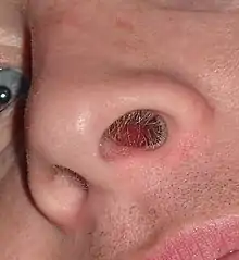 Nasal hair or nose hair, is the hair in the human nose. Adult humans have hair in the nostrils. Nasal hair functions include filtering foreign particles from entering the nasal cavity, and collecting moisture.[1] In support of the first function, the results of a 2011 study indicated that increased nasal hair density decreases the development of asthma in those who have seasonal rhinitis, possibly due to an increased capacity of the hair in the nostrils to filter out pollen and other allergens.[2]