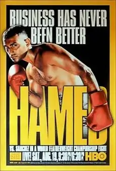 WBO featherweight champion Naseem Hamed and 22-year old prospect Augie Sanchez agreed to meet one another in June 2000 for an August title fight.[1] After knocking out the reigning super bantamweight champion Vuyani Bungu in the fourth round earlier in the year, Hamed and his team began negotiations for Hamed's next title fight to be against a highly-rated fighter, with Érik Morales and Marco Antonio Barrera being in the forefront. Other names such as Johnny Tapia, Danny Romero and Freddie Norwood were also mentioned, but none were able to agree to a deal.[2] Then-WBA super bantamweight champion Clarence emerged as the front-runner before Hamed ultimately chose to face the relatively unknown Sanchez. Sanchez had been a promising prospect, engaging in a rivalry in the amateurs with Floyd Mayweather Jr., having defeated him once in the 1996 pre-Olympic trials before losing twice to Mayweather which cost him a shot to make 1996 US Olympic boxing team.[3]
