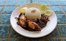 ![]() Nasi lemak with sotong pedas (spicy squid), sambal chili paste, boiled egg, slices of cucumber, ikan bilis and peanuts served at a restaurant in Penang | |