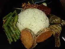 A special feature of this dish is the white rice used, although variations using brown rice may be preferred by health-conscious consumers.[22] Cooked with fresh coconut milk, and pandanus leaves (screwpine) thrown in, the rice is served on naturally fragrant banana leaves. This traditional serving style has been inherited for many generations -from a little stall by the road to commercials, it serves as simple way to fulfil the craving for this dish in large cities.