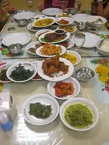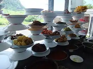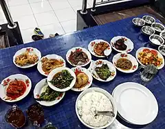 Nasi padang, sometimes referred to as Padang rice, is a Minangkabau dish of steamed rice served with various choices of pre-cooked dishes originating from West Sumatra, Indonesia. It is named after the city of Padang, capital of the West Sumatra province. A miniature banquet of meats, fish, vegetables, and spicy sambals eaten with plain white rice, it is Sumatra's most famous export and the Minangkabau people's primary contribution to Indonesian cuisine.[1]