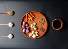 Other than cooked rice, nasi goreng consists of at least three components; ingredients (e.g. egg, shrimp, meat, cooking oil), bumbu spice or seasoning (e.g. garlic, shallot, salt, chili pepper), and condiments (e.g. bawang goreng, krupuk, acar pickles, slices of fresh cucumber and tomato). The combination of spices and ingredients in different ratio creates myriad variation of flavours.[27]