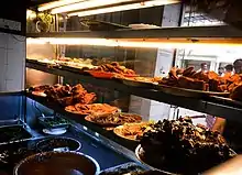 The rice for a nasi kandar dish is often placed in a wooden container about three feet high, giving it a distinctive aroma. The rice is accompanied by lauk-pauk (side dishes) such as ayam goreng, assortment of kari (curry) like kari daging (beef), kari limpa (beef spleen) and kari kambing (mutton); telur ikan, udang goreng or sotong goreng.[6] The vegetable dish would usually be terung (brinjals), bendi (okra) or peria (bitter gourd). A mixture of curry sauces is poured on the rice. This is called banjir ("flooded") and imparts a diverse taste to the rice.