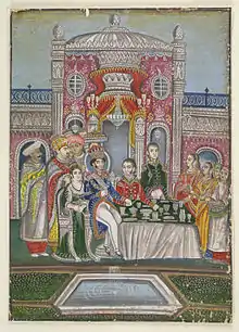 Nasir al-Din Haidar Shah is seen seated at a table with a British officer on his left and an English lady on his right