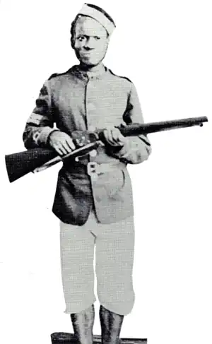 Three companies were raised, with a nominal strength of 5 white officers, 4 black officers and 96 men (though only No. 2 Company reached this strength). It had originally been intended that each company would be commanded by a regular British Army officer of the Royal Engineers, but there were too few to spare, and Durnford had to turn to the Natal government to supply suitable men. The Natal Colony also supplied the equipment for the troops: each man was provided with a pickaxe, shovel or crowbar and the non-commissioned officers were issued with a rifle. The men were issued uniforms of cast-off pre-1872 British Army issue red frock jackets; these were the traditional red coats but with the cuff facings and collar removed (these were coloured to identify individual British Army regiments). The Natal Pioneers were also issued knee-length white canvas trousers, a blue pillbox hand with a yellow band and a British Army greatcoat.[2] Durnford had intended that the entire NNC would be similarly uniformed but a lack of supply left them to make do with only a red rag tied around the head as an identifying badge.[9]