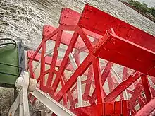 The Natchez IX is modeled not after the original Natchez, but rather the steamboats Hudson and Virginia. Her steam engines were built in 1925 for the steamboat Clairton, from which the steering system also came. From the SS J.D. Ayres were taken the copper bell, made of 250 melted silver dollars. The bell has on top a copper acorn that was once on the Avalon (now known as the Belle of Louisville), and on the Delta Queen. The Natchez IX also features a steam calliope that can play 32 notes. The wheel is made of white oak and steel, is 25 feet (7.6 m) by 25 feet (7.6 m), and weighs over 26 tons.[2] The whistle came from a ship that sank in 1908 on the Monongahela River. The Natchez IX was launched in Braithwaite, Louisiana. She is 265 feet (81 m) long and 46 feet (14 m) wide, has a depth of 7.9 feet (2.4 m), and measures 1384 tons.[3] Natchez IX is mostly made of steel, to comply with United States Coast Guard rules.[1][4]