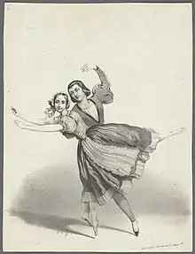Fitzjames danced the 'peasant pas de deux' in Act 1 of the premiere of Giselle with Auguste Mabille at the Paris Opéra in 1841.[4] She starred in La reine de Chypre, at the Salle Le Peletier of the Paris Opéra on 22 December 1841,[5] and afterwards toured in Italy, receiving acclaim in both Florence and Naples.[2][6]