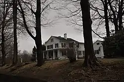 The Nathan B. Booth House stands in what is now a residential area of the Putney section of Stratford, on the east side of Main Street a short way north of the Boothe Memorial Park and Museum. It is set on a rise above the street, with its front facade facing west. It is a 2+12-story timber-frame structure, with a gabled roof and clapboarded exterior. A single-story porch of early 20th-century construction extends across the front facade and around part of the north and south sides. The main facade is three asymmetrically placed bays wide, with the main entrance set in the rightmost bay, flanked by sidelight windows and topped by a transom. The ground floor windows are full length in the Greek Revival style. The interior follows a fairly typical Greek Revival side hall plan, with a curved staircase rising in the main hall, and many other original period features.[2] It illustrates a vernacular transition between Greek Revival architecture and Federal architecture styles.[2]