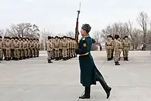 The guard of honor is formed from the 701st Military Unit of the National Guard. It take part in state visits and the presidential inaugural parade of the National Guard.[8] The soldiers of the guard of honor of the National Guard stand at attention at the National Flagpole on Ala-Too Square in Bishkek, performing a changing of the guard ceremony every hour since August 16, 1998. It also represented the Kyrgyz Republic at foreign military parades, particularly the 2015 Moscow and Beijing Victory Day Parade.[9] The unit is similar in structure and organization to Russia's 154th Preobrazhensky Independent Commandant's Regiment and Kazakhstan's Aibyn Regiment.[10] In November 2015, the unit received its first unit banner from General Janybek Kaparov.[11] The current commander of the company is the Captain Maksat Rahimdinov.