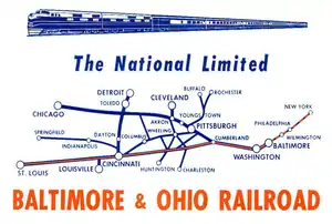 The National Limited was the premier train of the Baltimore and Ohio Railroad (B&O) on its route between Jersey City, New Jersey and St. Louis, Missouri, with major station stops in Washington, D.C., and Cincinnati, Ohio. (Buses took passengers from New York City to Hudson River ferries; the travelers would transfer onto trains in Communipaw Terminal in Jersey City.) It operated from 1925 to 1971. For much of its life it offered exclusive all-Pullman service, and it was the first long-distance train to be entirely air-conditioned. The National Limited was one of many trains discontinued when Amtrak began operations on May 1, 1971. Amtrak revived the name for another New York–St. Louis service which did not use the B&O route.