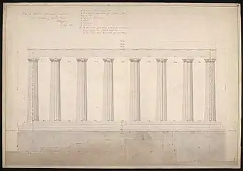 In January 1822, a proposal was put forward to 'erect a facsimile of the Parthenon' at a cost of some £42,000. The appeal found support amongst many prominent Edinburgh residents such as Sir Walter Scott, Henry, Lord Cockburn and Francis, Lord Jeffrey.[7] The leading man behind the campaign to model the new monument specifically on the Athenian Parthenon was Thomas Bruce, 7th Earl of Elgin, who had controversially removed many of the temple's sculptures (now known as the Elgin Marbles) a decade earlier and brought them to Britain.[8] In July 1822 the Royal Association of Contributors to the National Monument of Scotland was incorporated by an Act of Parliament. The foundation stone was laid, amid great pomp and ceremony, the following month.[9]