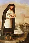 Some colonists sought to convert the native women involved in these relationships into Christians[22] Pocahontas’ story exemplifies the many marriages that brought alliances between tribes and colonists.[23] A portrait of Pocahontas was made depicting a woman in stiff European clothes, stripped of her native identity.[23] Some native women converted to Christianity, most notably Kateri Tekakwitha, Lily of the Mohawks. Tekakwitha was taught Catholicism from mother, who had been baptized by French missionaries. Tekakwitha converted to Catholicism when she was 19, a decision that elicited scorn and harsh treatment from her tribe.[24]