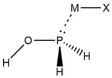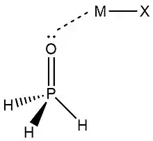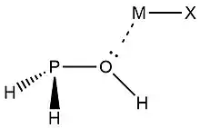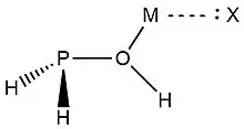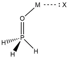 Zheng et al., also analyzed MX interactions with trans- and cis-phosphinuous acid to compare the electron donating abilities of phosphorus and oxygen atoms. The results above demonstrate that when phosphorus acts as the electron donor the weights of ωI and ωII are similar.[9] This is indicative of 3-center 4-electron bonding models. Despite greater mixing, ωII is determined to be the best natural Lewis structure for both the trans- and cis- complexes, with CuBr and AgBr as the only exceptions. Researchers explain that this result is consistent with analyses showing the preference for phosphorus to form covalent interactions. Overall, "the degree of covalency for P–M bonds decreases in the order of F> Cl > Br, Au > Cu > Ag, while the degree of noncovalent for O–M bonds, there is an increase according to F < Cl < Br, Au < Cu < Ag in the entire family."[9]