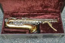 Additionally, another saxophone manufacturer called Dörfler & Jörka was located in Nauheim between 1949 and 1968.[3] D&J had a close and complicated relationship with Keilwerth. D&J were originally employed as subcontractors for Keilwerth, making saxophone bodies and other component parts, then sending them back to the nearby Keilwerth factory for final assembly. Eventually, D&J started to manufacture their own complete saxophones (without any Keilwerth involvement) before supplying them directly to German musical instrument retailers as well as the export market. Saxophones manufactured by Dörfler & Jörka for distribution direct to retailers featured their own key mechanisms which were very closely modelled on Keilwerth designs, though not completely identical. It is important to note that D&J saxophones are not Keilwerth "stencils", but rather are nearly identical copies of Keilwerths from the same era e.g. they have rolled tone holes and are high quality, professional-grade instruments. As a result, the tonal characteristics of Dörfler & Jörka saxophones are very similar to Keilwerth instruments and share the distinctive Keilwerth sound i.e. have the same "dark", "smoky", "punchy" and "woody" Keilwerth tone colours, compared to the "brighter" and more neutral sound of, say, Yamaha saxophones.[4] Not surprisingly, it can be very difficult to distinguish the sound of D&J instruments from Keilwerth-manufactured saxophones dating from the same time period e.g. the Keilwerth 'New King' and 'Tone King' models.