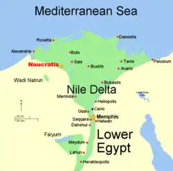 Naucratis or Naukratis (Ancient Greek: Ναύκρατις, "Naval Command";[1] Egyptian: njwt-kꜣrṯ, nskꜣrṯ, pr-mryt,[2] Coptic: Ⲡⲓⲉⲙⲣⲱ Piemro) was a city and trading-post in ancient Egypt, located on the Canopic (western-most) branch of the Nile river, south-east of the Mediterranean sea and the city of Alexandria. Naucratis was the first and, for much of its early history, the only permanent Greek settlement in Egypt, serving as a symbiotic nexus for the interchange of Greek and Egyptian art and culture.