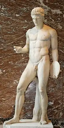 Taught under Polykleitos, he created a statue of gold and ivory of Hebe for the temple of Hera in Argos; also, statues of Hecate, Hermes, of the poet Erinna, and Phrixus. The discobolus of Naukydes was identified by Ennio Quirino Visconti, as mentioned by Pliny.[1]