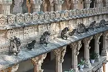 Gondal was the capital city of a Jadeja Rajput clan.[5] The Naulakha Palace is said to be the oldest palace in the Gondal area. It has very exclusive architectural features of arcades, jharokas, a royal audience hall (durbar hall) (which is still used by the present Maharaja), a winding stairway, shining chandeliers, decorated mirrors and antique furnishings.[4] It is a unique triple storied edifice with an open arcade with stone carvings on the first floor flanked by towers. The eaves above the stone fittings on this floor are carved with sculptures of real and mythical animals. A part of the first floor also houses a museum which has elegant architectural features over the rooms with carvings made out of wood and stone over its doors. The exhibits in the museum include artifacts collected by the Maharaja of a large number of toy cars, pictures, a library of books, trophies and so forth. The decorated balcony provides scenic views of the Gondal town. The side room on the left side of the palace has exhibits of kitchen ware and a pair of huge weighing balance; the weighing balance was used on special celebrations of the Maharaja's birthdays when he used to be weighed in gold equivalent which would then be donated to the poor. Another interesting scene noted near a bridge over the river is the reflected image of the palace.[2]
