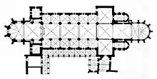 The cathedral is a double-choir three-aisled basilica with a pair of towers at the east and west end, flanking the choirs. Due to the presence of choirs at both ends, the church is entered from the sides. The main entry is on the south side, from the cloister or gate house. The choirs are divided from the nave by two rood screens.[4]: 10