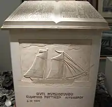 The exhibits are either collected from the households of the former seafarers or were donated by shipowners or the navy.[1] In front of the building are anchors, buoys, ships propellers and a torpedo. Although the museum is dedicated to merchant shipping, the tour begins with a model of a torpedo boat, which, in 1912, sank a Turkish warship in front of the port of Thessaloniki. Old pictures, some almost 100 years old, show proud families in the shipyard who supervise the construction of their ship. Other pictures show sailors on board or in port. In several showcases are impressive ship models. Many of these are original replicas of ships that were once home here. Others represent a cross-section of traditional Greek ships over the centuries.