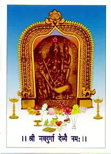 Navadurga is the Kuldevta (family deity) of many Gaud Saraswat Brahmins (GSBs) and Daivadnya Brahmins in India—in Goa and Maharashtra. Due to the forceful Portuguese conversion and intervention into their rituals, the Deity with all the other purushas had to be shifted from Gavasim to their present respective places. The Saraswats and Daivadnyas who left to the north of Goa, established a temple in the honours of the Goddess and revering her in nine different locations. The present temple along with the kulpurushas is located in Vengulara Redi (Maharashtra). The other Saraswats and Daivadnyas who left to the East of Goa along with their Kulapurushas established a temple dedicated to the Goddess. Today the magnificent temple located in Madkai, is famous for its Navadurga having a tilted head. Legend says that a wealthy Saraswat merchant when placed a flower worth Rs. 1000, the Goddess tilted her head acknowledging the merchant's devotion. A similar legend follows at the Katyayani Baneshwar, a Konkani temple (once located in Benaulim, Goa) now located in Aversa, Karnataka. Here Katyayani too like the Navadurga has a tilted head. As the legend goes, a goldsmith belonging to Daivadnya Brahmin community living in the village of Madkai was ordered by temple authorities to fabricate a mask of the goddess Navdurga. The goddess appeared in the goldsmith’s dream and told him to make the mask similar to his daughter’s face. The mask was prepared resembling his daughter’s face, but after few days his daughter became weak and died. The goldsmith was very sad because of her death. The goddess appeared before him once again and told him that she will visit his house once in a year as his daughter. Hence as a tradition goes the same mask of the goddess is welcomed in the goldsmith’s house on Karthik Shukla Asthami day every year. This day is celebrated by the Madkaikars (goldsmith's family) in the same way as a married girl visiting her paternal home. The Navdurgas located in Madkai (Goa), Kundaim (Goa) and Redi (Vengurla - Maharashtra) are considered to be Saraswat Kuldevtas whereas the others are gram devtas or normal Hindu temples.