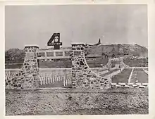 In addition to 328 Purple Hearts, 133's men received 10 Bronze Stars and 29 Marine Corps Commendations.[35] Before that happened the battalion crushed over 100,000 tons of volcanic rock, moved over 1 million cubic yards of volcanic soil, laid 5,800 feet of sewer line, installed 4,000 feet of electrical conduit and poured 725 cubic yards of concrete.[36] 133 graded the site and built the entrances for both the 3rd Marine Division and the 4th Marine Division at the cemetery on Iwo.