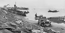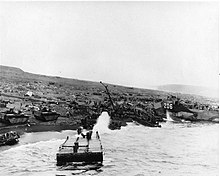 B Co was the major component of the shore party posted to 2nd Battalion 23rd Marines or 2/23 which was the right "Assault" battalion for yellow beach.[6] They also landed at 0935, but on blue 2 from the APA 207 – USS Mifflin and LSM-202.[20][17] That beach had a Homophone "Blew to" Hell beach. Mortar fire was so heavy they could not move to yellow 2, but were ordered to because, the situation became critical for the 4th Pioneers that had made it to y2. A Co. 4th Pioneers was split in two to share their combat experience/knowledge and was attached to B Co 133.[18] On D+1 LSM-202 landed 3 D8s and a crane for B Co. B Co's security sections landed the same as A Co and also went forward until needed. The USN beach party from the USS Mifflin was assigned to serve with B Co.[21] Also with B Co was a 32-man beach team from the 8th Marine Depot Company as well as B Co 24th Marines replacement draft. On D+1 the acting Shore Party commander on beach yellow 2 was wounded and command transferred to B Co. Commander 133.