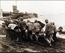 The Unit Histories of both the 4th and 5th Marine Divisions state that the conditions on the beach for the (Red Patch) Shore Parties and the (yellow patch) USN Beach Parties were worse than the front lines. D-day all personnel were initially employed to aid the evacuation of casualties. From D-day until D+5 the men were on duty 24 hrs a day. To get sleep men would go up to the front lines where it was safer. D+5 to D+8 work was 4 hrs on 4 hrs off. From D+8 to D+14 work was 4 hrs on 8 hrs off. On D+14 it changed to straight 8 hr shifts. The corpsman, security sections, equipment operators and truck drivers were on call at all times, from the beginning to the end of the assault.[27] On D+18 (9 March) 133's Companies were relieved by the Army Garrison Shore Party. The battalion reorganized and returned to the Navy.